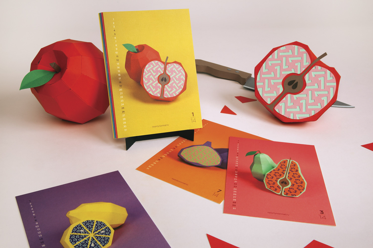 This is the Nearly Normal 2014 calendar. Made completely from paper, it's a fruit calendar but with a Nearly Normal twist!