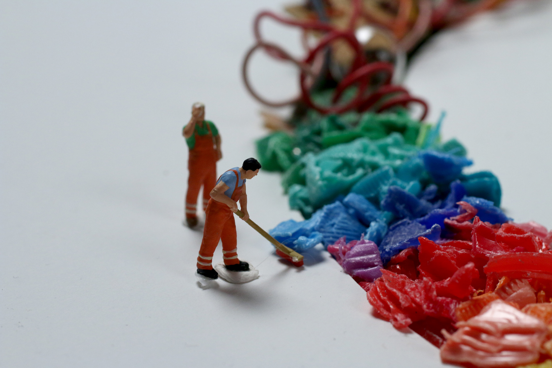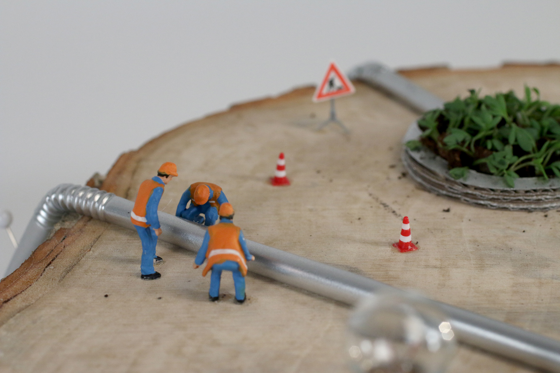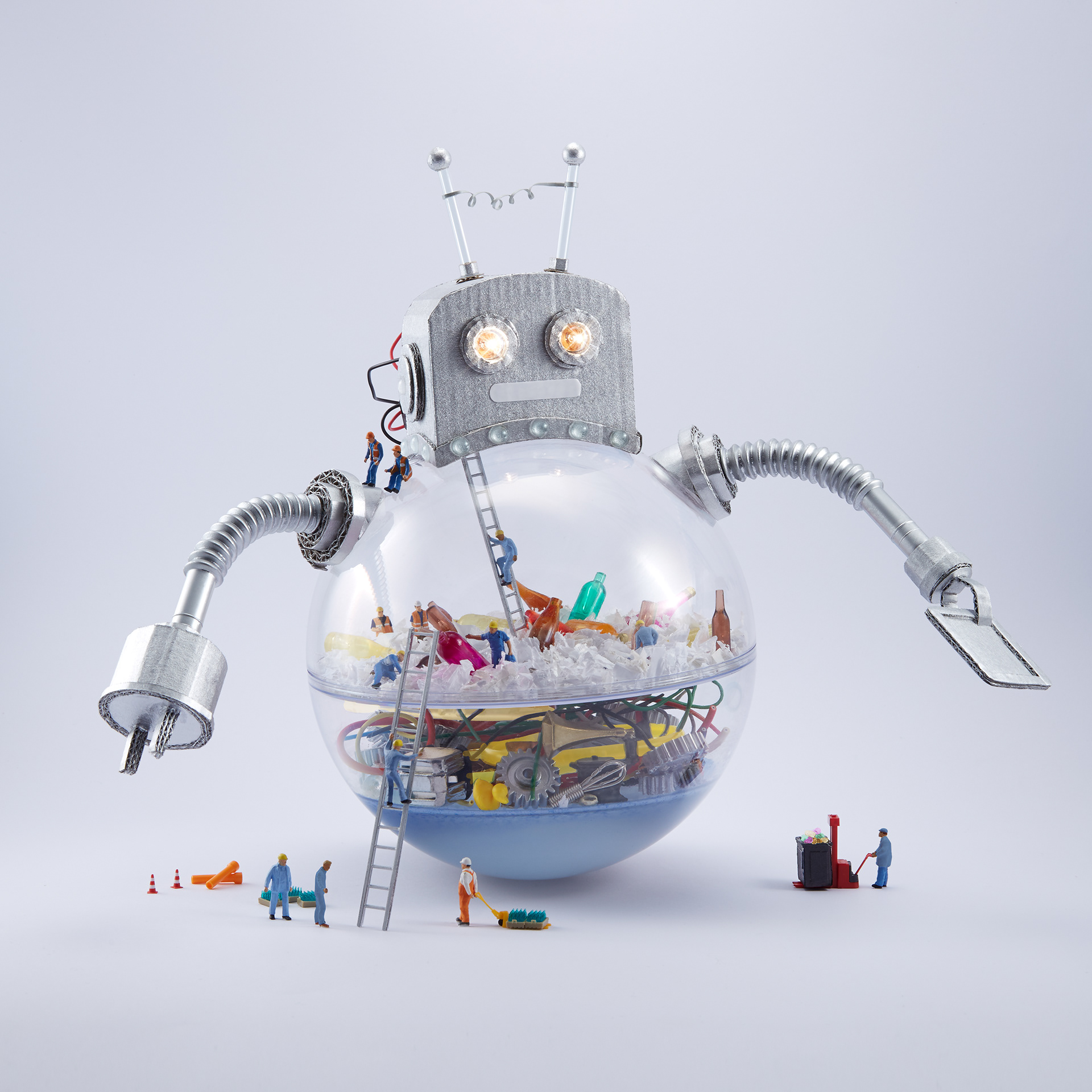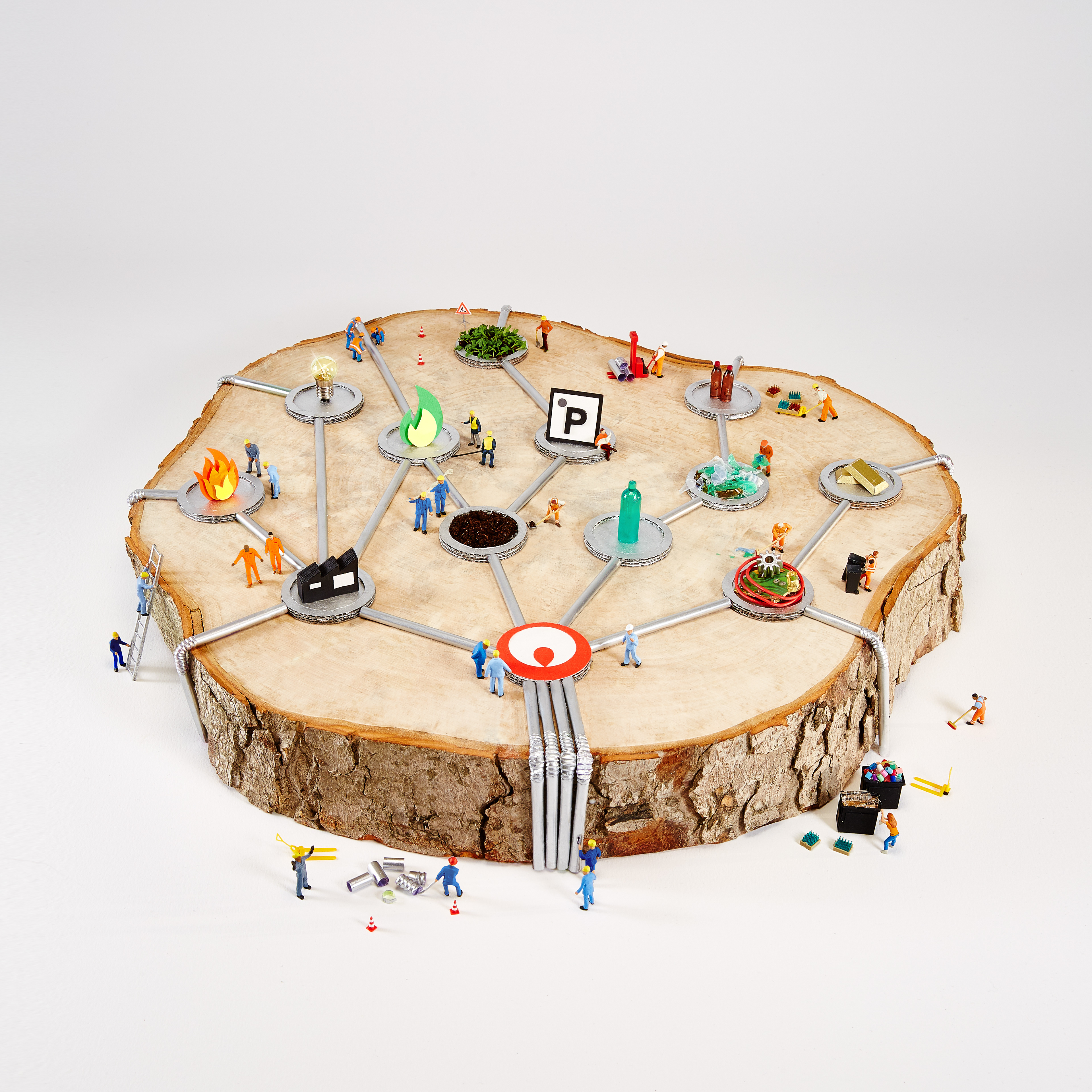 Using tangles of cables, shards of rainbow colored glass, scraps of paper, plastic pieces and even real garden cress, I created five contrasting scenes that show how Veolia turn trash into treasure – all populated by miniature Veolia employees hard at work. Every individual craft echoes the round shape of the Veolia logo, while distinctly demonstrating different aspects of their work, what Veolia stands for and what they do as a recycling company – for the environment, for their own workers and for society as a whole.