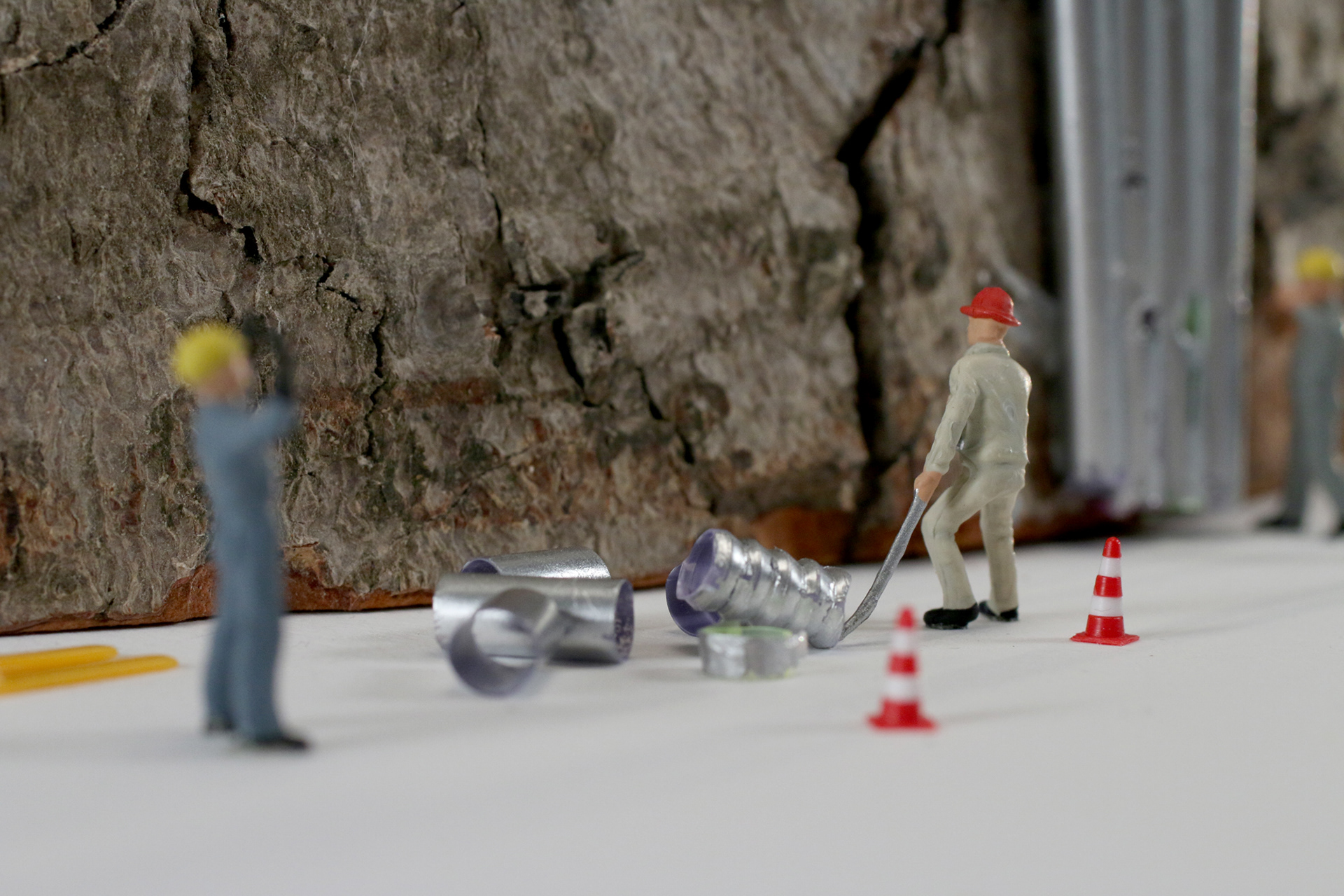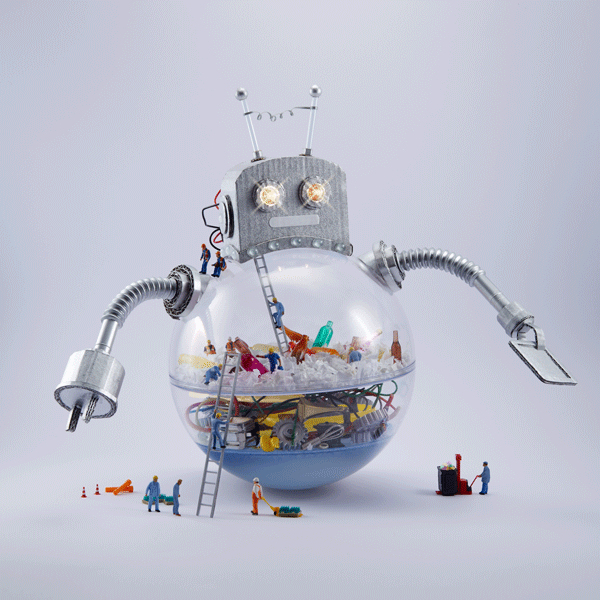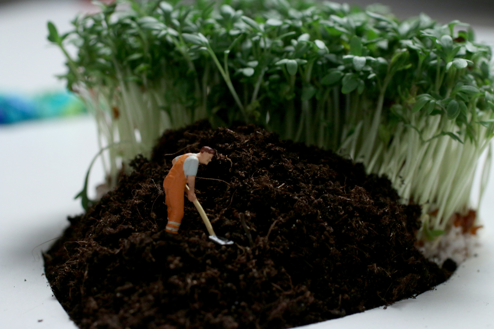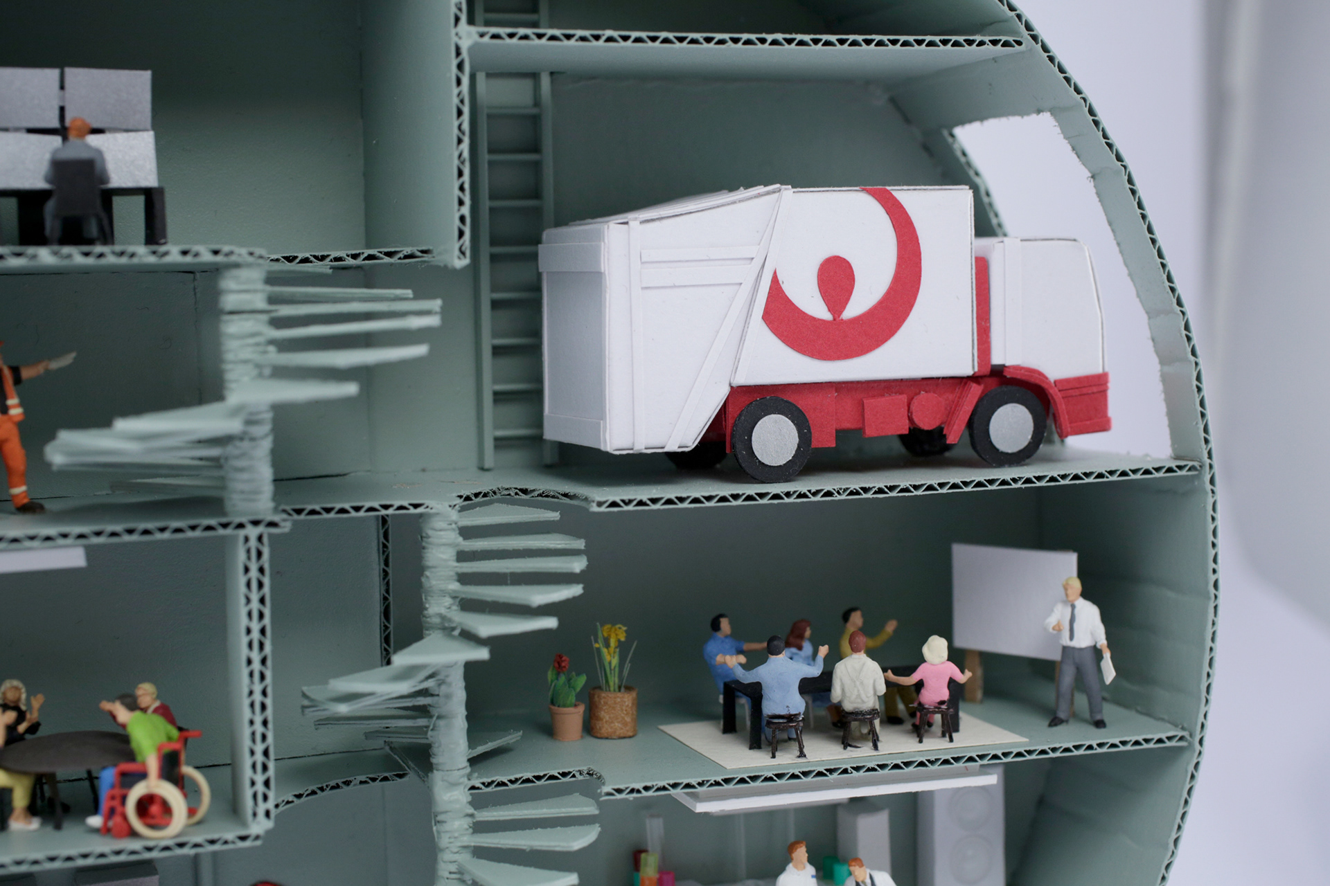 Using tangles of cables, shards of rainbow colored glass, scraps of paper, plastic pieces and even real garden cress, I created five contrasting scenes that show how Veolia turn trash into treasure – all populated by miniature Veolia employees hard at work. Every individual craft echoes the round shape of the Veolia logo, while distinctly demonstrating different aspects of their work, what Veolia stands for and what they do as a recycling company – for the environment, for their own workers and for society as a whole.